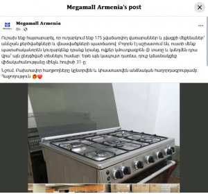 Facebook սոցիալական ցանցում բացվել է նոր էջ՝ «Megamall Armenia» անվամբ, որը հրապարակել է միայն մեկ գրառում՝ օգտատերերին կոչ անելով մասնակցել 175 վառարանների և լվացքի մեքենաների ակցիային, որոնք չեն վաճառվել «աննշան քերծվածքների և վնասվածքների պատճառով»։