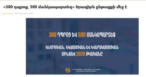 ԿԳՄՍ նախարարության տվյալներով՝ «300 դպրոց» ծրագրի շրջանակում 2021 թվականից մինչև 2025 թվականը շինարարական աշխատանքներն ավարտվել են 59 դպրոցներում․ 35-ում իրականացվել է կառուցման, 22-ում՝ հիմնանորոգման, 3-ում՝ վերակառուցման աշխատանքներ: