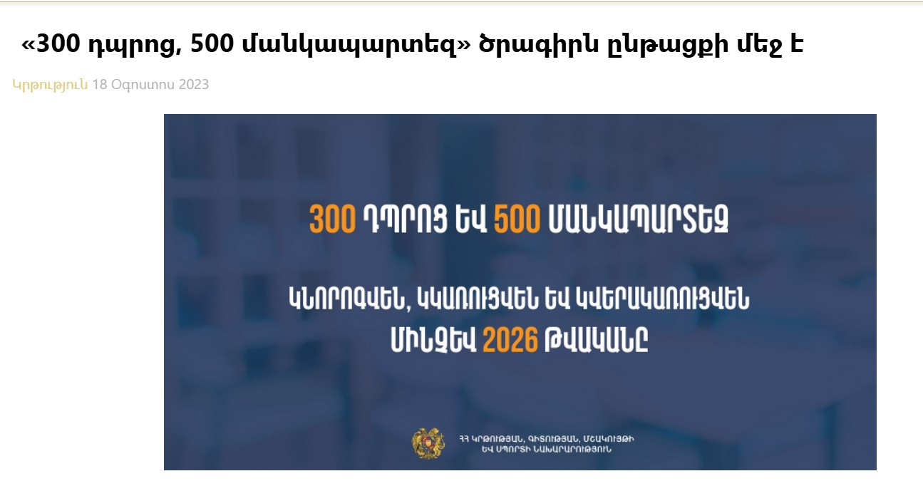 ԿԳՄՍ նախարարությունը, 2023 թվականի օգոստոսին իր պաշտոնական կայքում հրապարակած հաղորդագրությամբ անդրադառնալով թեմային, նշել է, որ «300 դպրոց և 500 մանկապարտեզ» կնորոգվեն, կկառուցվեն և կվերակառուցվեն մինչև 2026 թվականը։