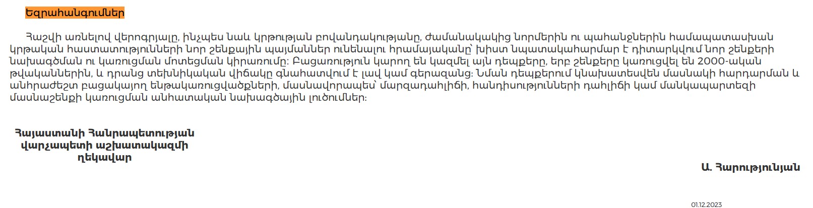 Իսկ 2024 թվականին ընդունված փոփոխված տարբերակում նույն հատվածը ներկայացված է այսպես․ «Հաշվի առնելով կրթության բովանդակությանը, ժամանակակից նորմերին ու պահանջներին համապատասխան կրթական հաստատությունների նոր շենքային պայմաններ ունենալու հրամայականը՝ խիստ նպատակահարմար է դիտարկվում նոր շենքերի նախագծման ու կառուցման մոտեցման կիրառումը։ Բացառություն են կազմում այն դեպքերը, երբ շենքերի տեխնիկական վիճակը գնահատվում է բավարար»։