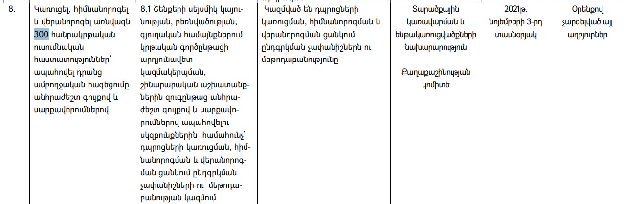 Մինչև 2026 թվականը կառուցել, հիմնանորոգել և վերանորոգել առնվազն 300 հանրակրթական ուսումնական հաստատություններ, դրանք ապահովել անհրաժեշտ գույքով և սարքավորումներով․ սա Հայաստանի Հանրապետության կառավարության խոստումն է, որն ամրագրված է Կառավարության 2021-2026 թվականների գործունեության միջոցառումների ծրագրում։