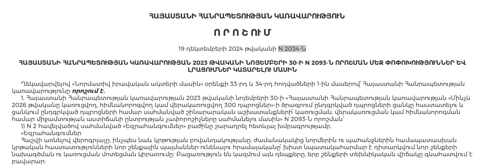 2․ Փոփոխվել է նաև որոշման եզրահանգումներ հատվածի բովանդակությունը։ 2023 թվականի որոշման տարբերակում շեշտադրված է․ «Հաշվի առնելով կրթության բովանդակությանը, ժամանակակից նորմերին ու պահանջներին համապատասխան կրթական հաստատությունների նոր շենքային պայմաններ ունենալու հրամայականը՝ խիստ նպատակահարմար է դիտարկվում նոր շենքերի նախագծման ու կառուցման մոտեցման կիրառումը։ Բացառություն կարող են կազմել այն դեպքերը, երբ շենքերը կառուցվել են 2000-ական թվականներին, և դրանց տեխնիկական վիճակը գնահատվում է լավ կամ գերազանց»։