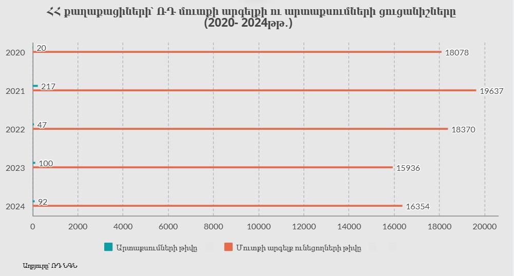 5 տարիների ընթացքում ՌԴ մուտքի արգելք է ստացել 88․375 ՀՀ քաղաքացի․ 2020 թվական՝ 18.078, 2021 թվական՝ 19.637, 2022 թվական՝ 18.370, 2023 թվական՝ 15.936, 2024 թվական՝ 16.354 քաղաքացի: