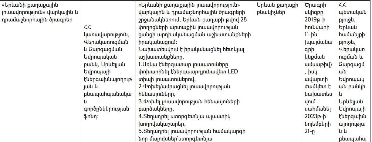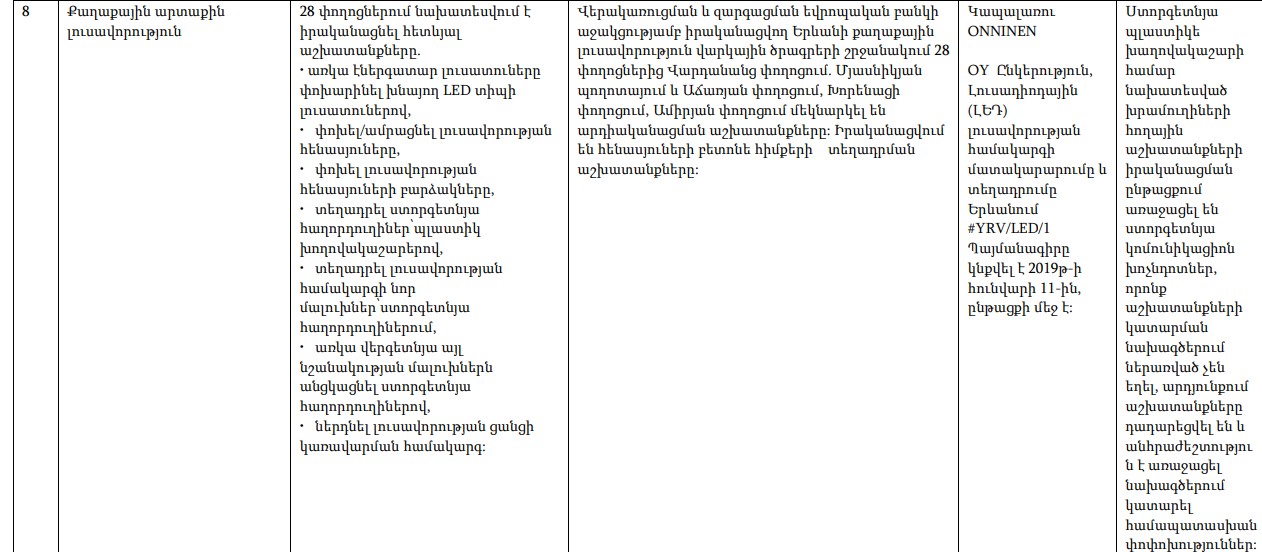 Երևան քաղաքի զարգացման 2021 թվականի ծրագրի իրականացման հաշվետվության մեջ քաղաքապետարանն արդեն նշել էր Վերակառուցման և զարգացման եվրոպական բանկի աջակցությամբ իրականացվող Երևանի քաղաքային լուսավորություն վարկային ծրագրերի շրջանակում 28 փողոցներից 5-ում  արդիականացման աշխատանքների մեկնարկի մասին, ապա տեղեկացրել  ծրագրի իրականացման ընթացքում ի հայտ եկած խոչընդոտների և այդ հիմքով նախագծում կատարվելիք փոփոխությունների անհրաժեշտության մասին։